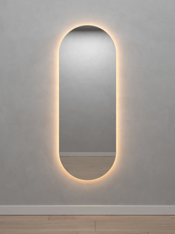 Безрамное зеркало овальной (капсульной) формы с контурной (тыльной) тёплой подсветкой, свет 3000К. Подложка из высококачественного МДФ, светодиодная лента защищена матовым свето-рассеивателем от попадания пыли и влаги. Есть вывод 220W для подключения к сети, включение подсветки от выключателя на стене, либо от розетки.